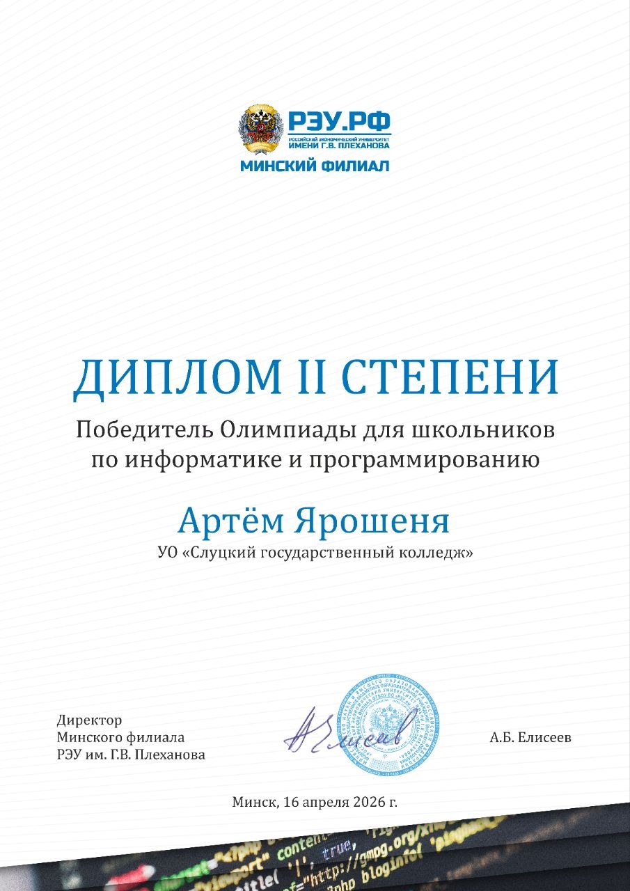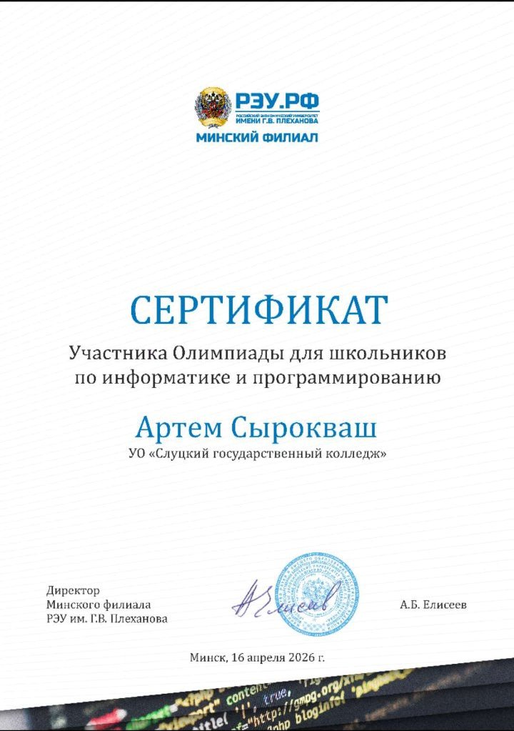 С 16 по 23 апреля 2026 года учащиеся нашего колледжа приняли участие в открытой Олимпиаде по информатике и программированию, организованной Минским филиалом Российского экономического университета имени Г.В. Плеханова.