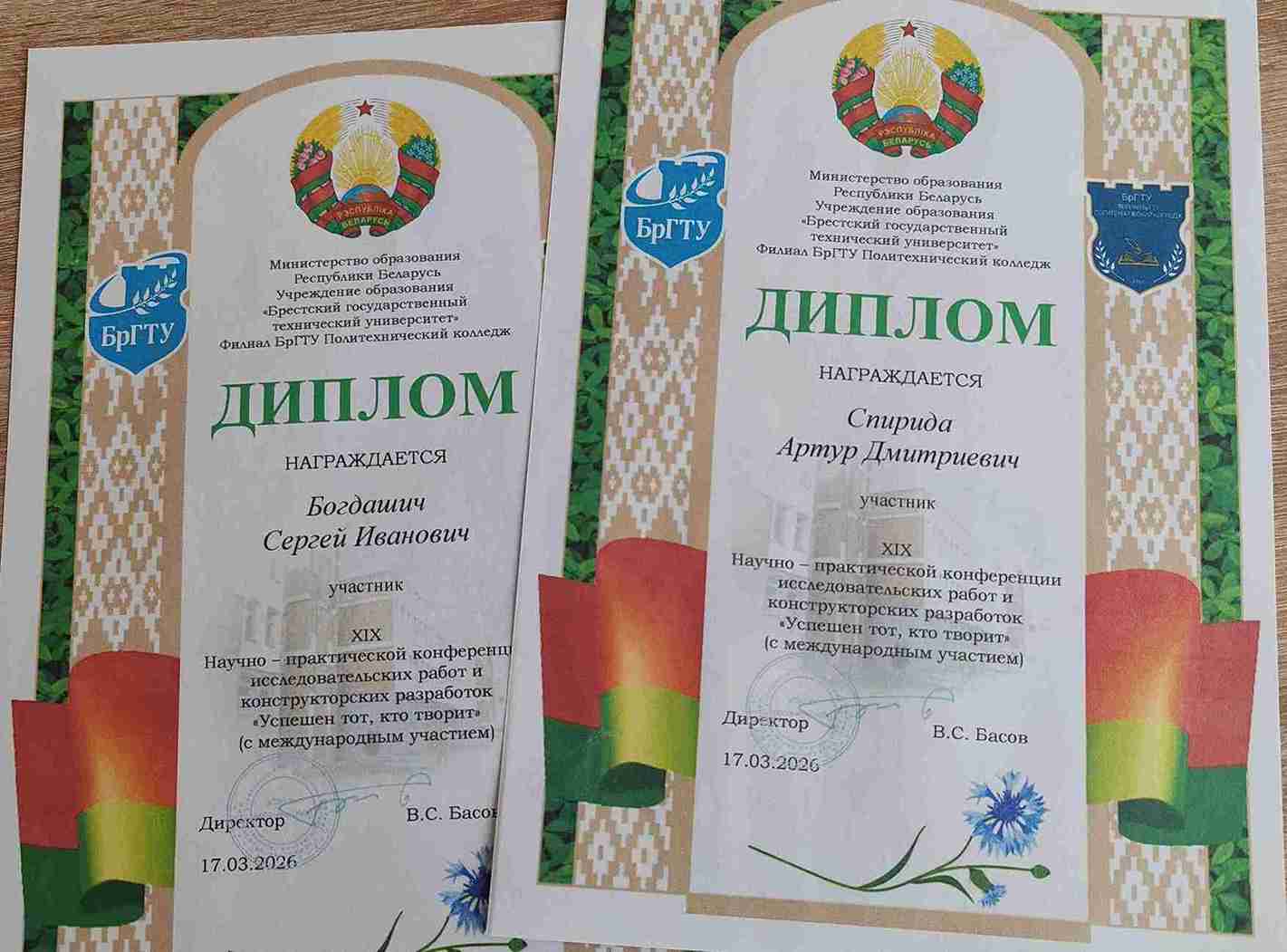 17.03.2026 учащиеся и преподаватели колледжа стали участниками XIX научно-практической конференции исследовательских работ и конструкторских разработок учащихся, студентов и преподавателей учреждений среднего специального и высшего образования «УСПЕШЕН ТОТ, КТО ТВОРИТ» (филиал учреждения образования «Брестский государственный технический университет» Политехнический колледж).